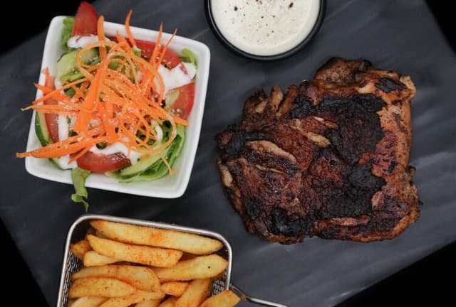 150g beef or chicken patty, lettuce, tomato, caramelised onions, cheddar cheese, turkey bacon, crispy chicken ham, BBQ sauce & mayonnaise